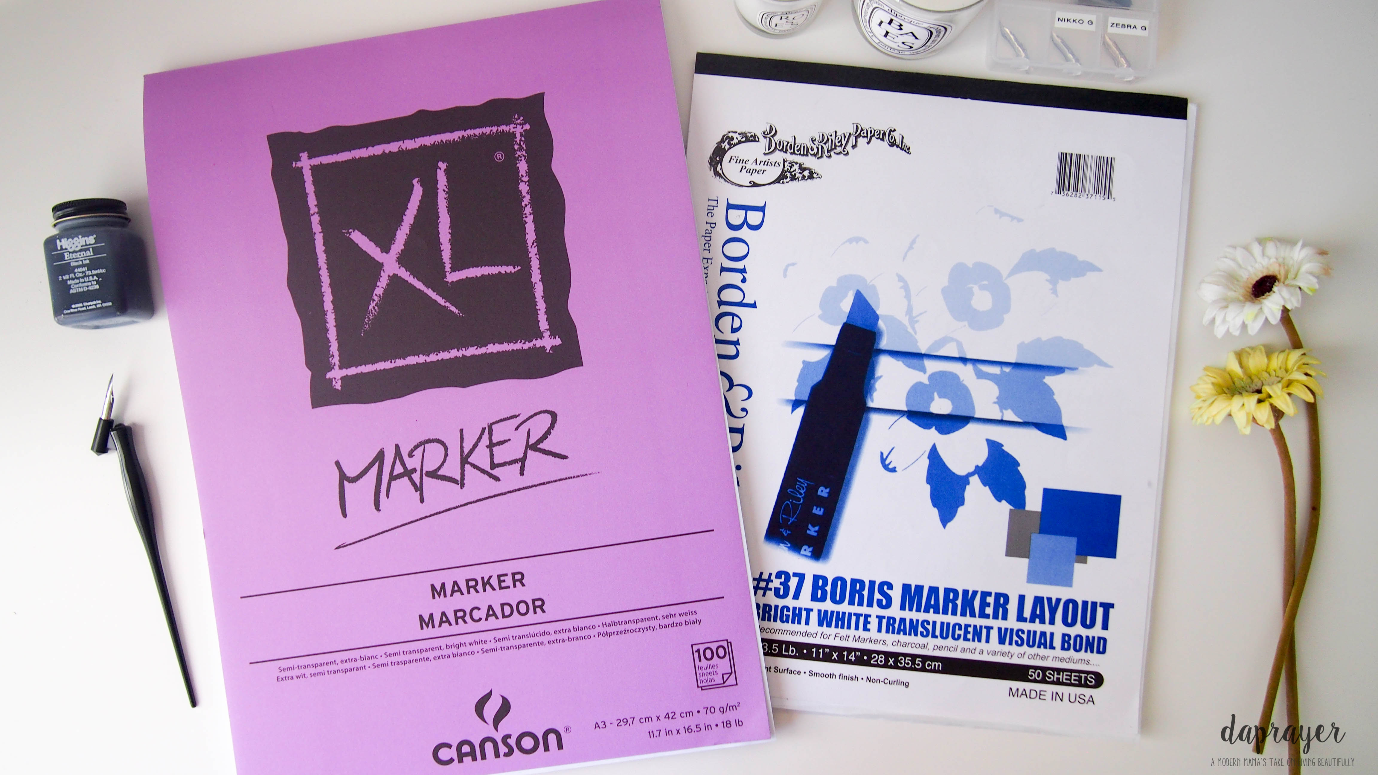 | Ink | Sumi Ink/ Higgins Eternal | Both are great to use, but I find Sumi ink leaving a shinier sheen when it dries compared to Higgins. |